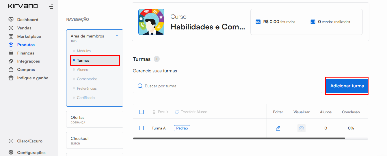 Dentro da área de membros, clique na aba Turmas em seguida clique em "Adicionar turma".