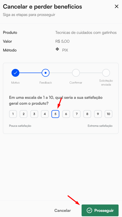 Informe o seu grau de satisfação com o infoproduto adquirido e clique em Prosseguir.