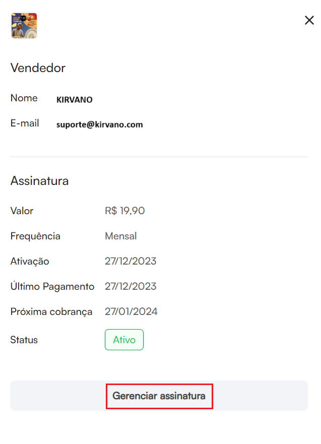 No menu Compras, localize o infoproduto que deseja o estorno e clique em cima dele, irá abrir as informações da sua compra, clique em Gerenciar assinatura.