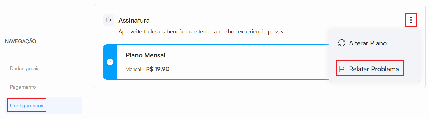 Ao lado esquerdo em Navegação, selecione a opção Configurações, em seguida, clique nos 3 pontinhos ao lado de "assinatura", onde abrirá a opção Relatar problema para dar continuidade no estorno.