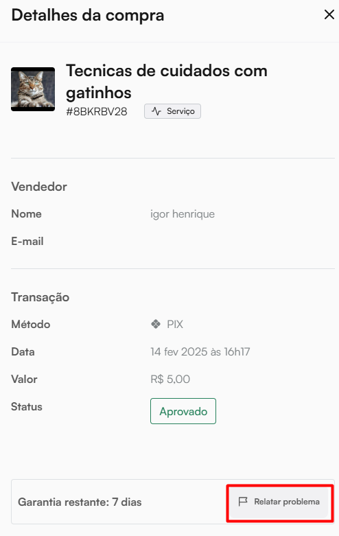 No menu Compras, localize o infoproduto que deseja o estorno e clique em cima dele, irá abrir as informações da sua compra, clique em Relatar problema, se a compra estiver dentro do prazo de 7 dias, a opção de Quero cancelar a compra estará disponível.