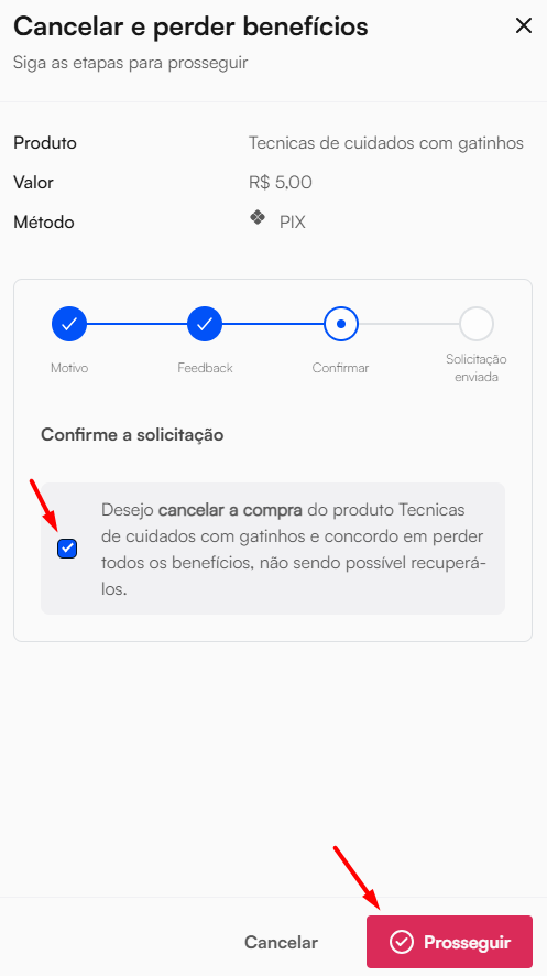 Confirme a solicitação marcando o checkbox de Desejo cancelar a compra e clique em Prosseguir.