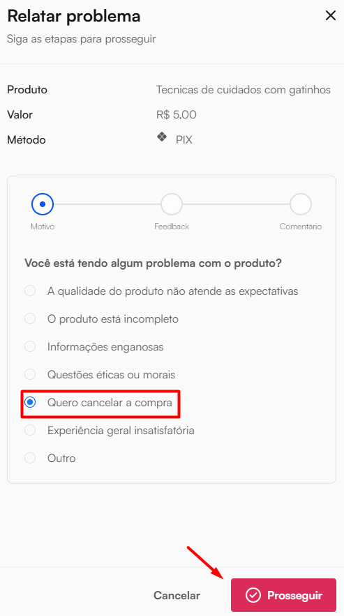 Após clicar em Relatar problema, selecione a opção Quero cancelar a compra e depois clique em Prosseguir.