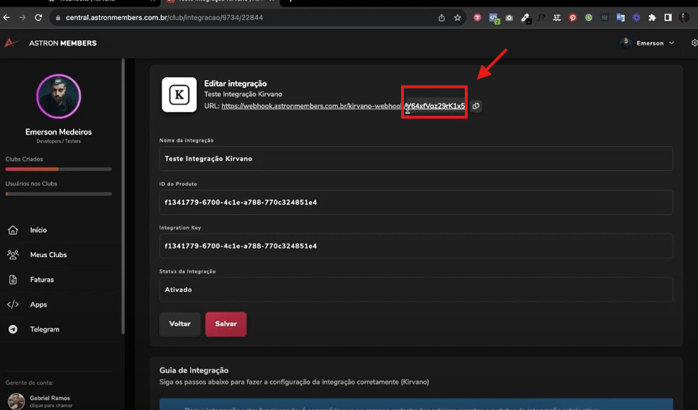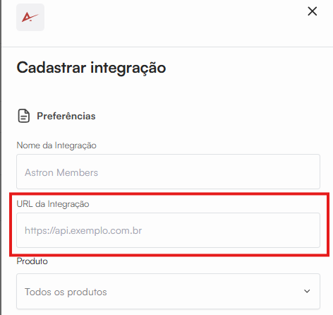 Agora, copie a URL de integração no Astron Members e cole no campo URL da Integração na Kirvano.