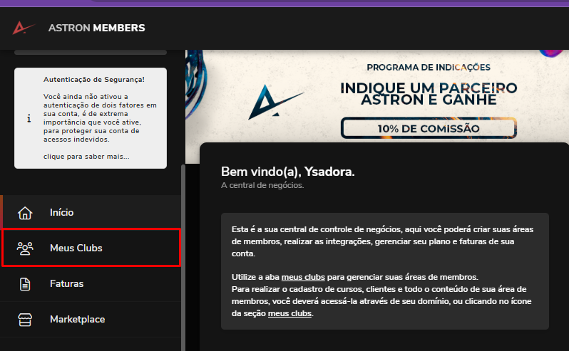 O primeiro passo deve ser realizado no Astron Members. Faça login na sua conta e, no menu lateral esquerdo, acesse a opção Meus Clubes.