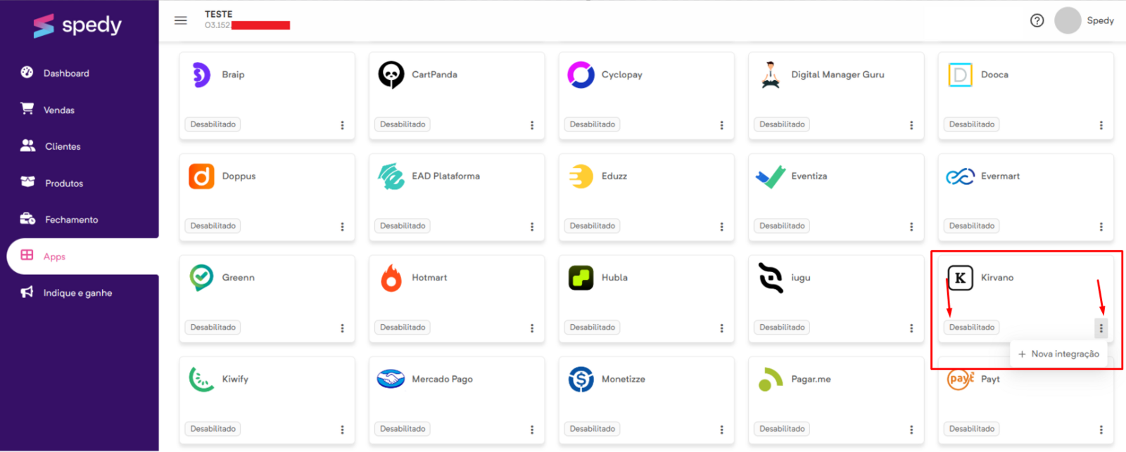 Após logar em sua conta na Spedy, clique em Apps no menu lateral e, no card da Kirvano, clique no botão Desabilitado ou no botão Mais Ações (três pontos) > + Nova Integração.