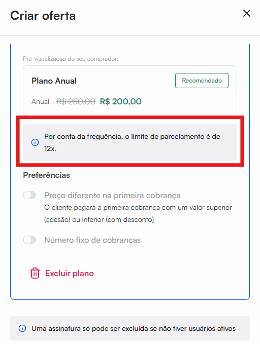 Planos por assinatura só podem ser adquiridos por Cartão de Crédito ou Pix. Além disso, planos por assinatura não podem ser oferecidos como Orderbump ou Upsell.