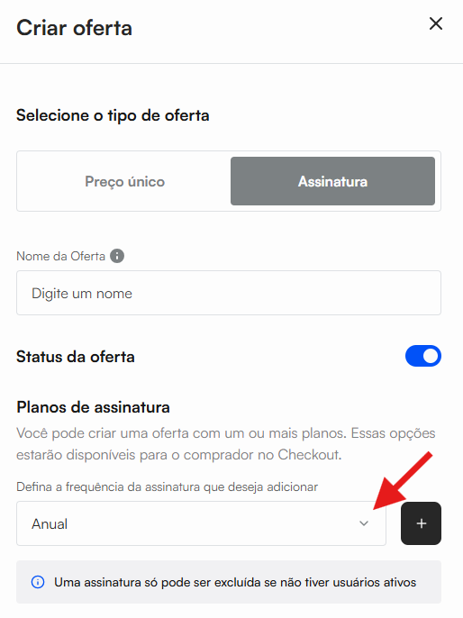 Em sequência aparecerá a opção de assinatura e ao clicar nele, você digita o nome da sua oferta e cria o seu plano por assinatura.