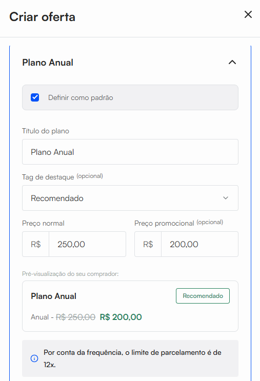 Cada tipo de plano terá a quantidade de parcelas fixas, onde serão apresentados no checkout. Por exemplo: