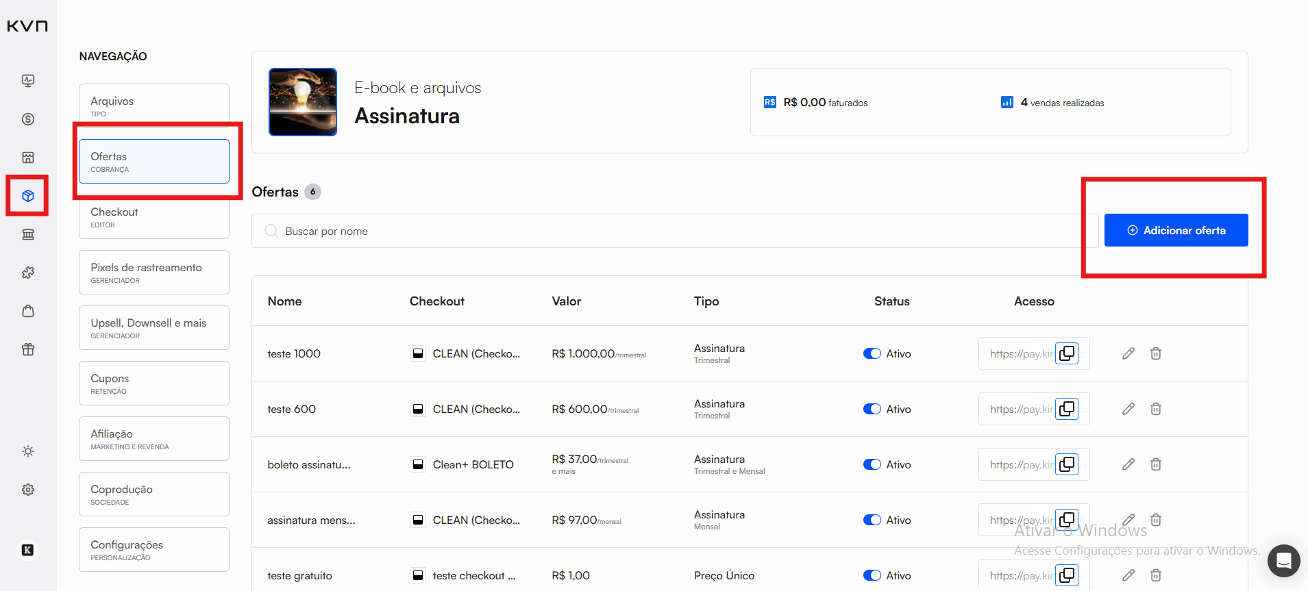 Entre no seu produto já criado, clique em oferta e adicione uma oferta nova.