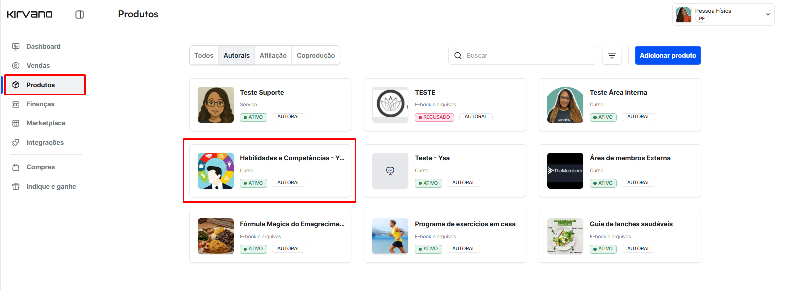 No menu lateral, clique em Produtos e selecione o Produto que deseja excluir