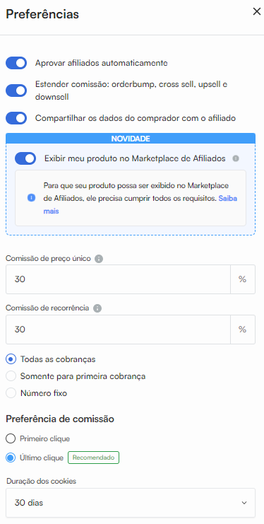 Nesse processo você consegue definir todas os critérios que queira para afiliação do seu produto, desde aprovação automática, permitir exibição no Marketplace, valor de comissão e diversas outras preferências.