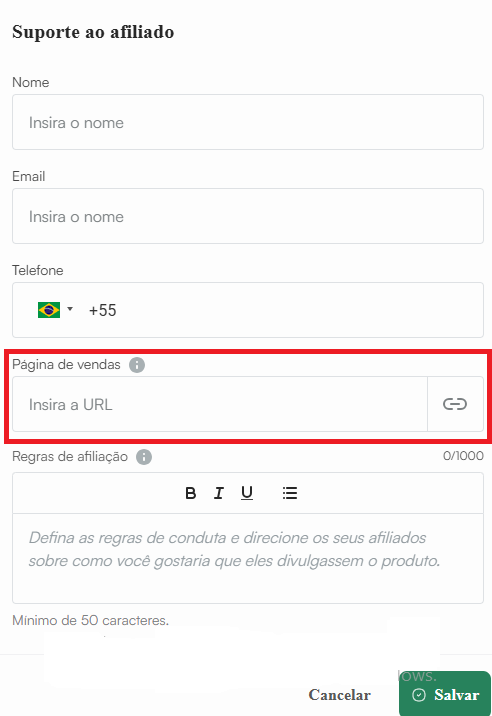 O campo 'página de vendas", é onde você vai liberar a página do produto para que seu afiliado consiga usa-la para divulgação.