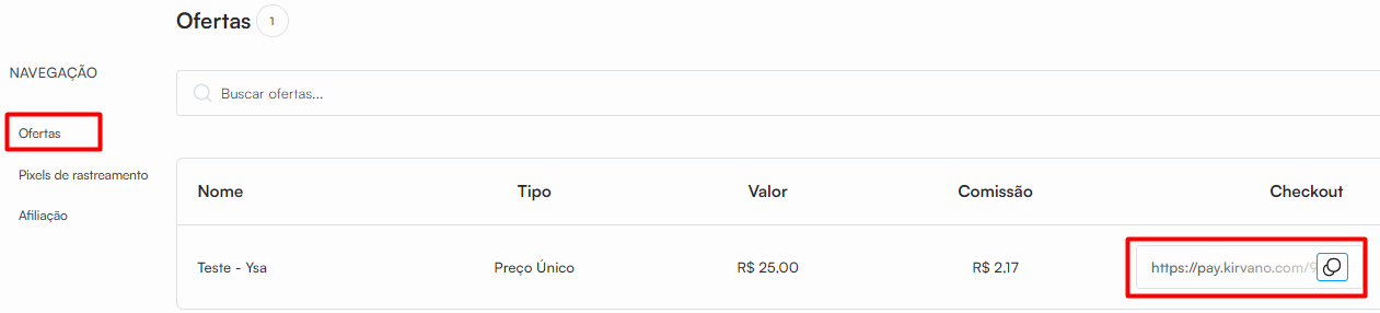 No menu Ofertas você obtém o link do checkout