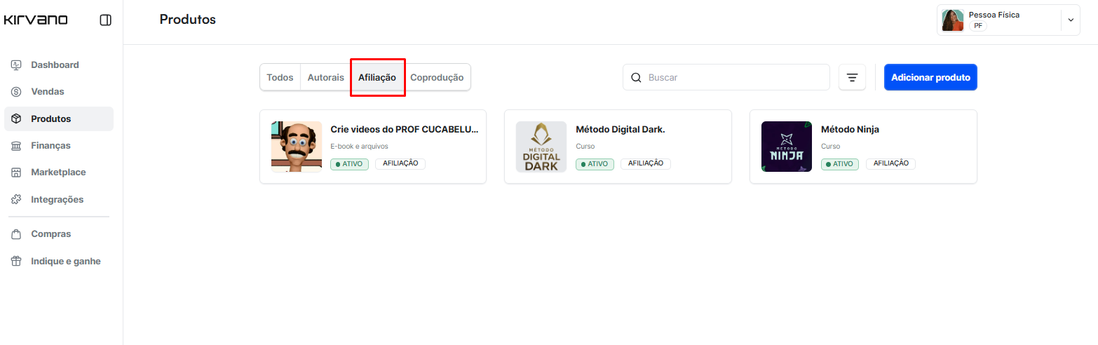 Clique no menu Produtos (Esse menu fica disponível somente pelo computador) e selecione o produto que você se afiliou.