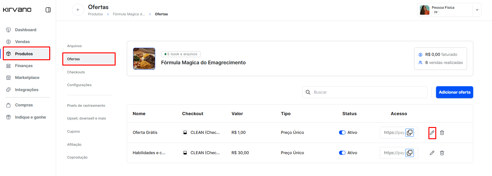 Em seguida selecione "Ofertas" e em depois clique no ícone de "Editar" a oferta.