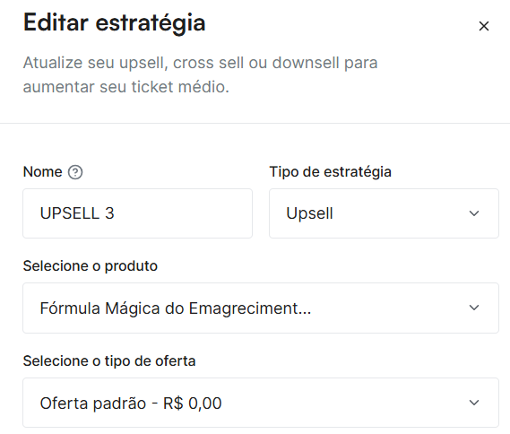 Após criar a estratégia, chegamos ao último passo para concluir a configuração do Up-sell.