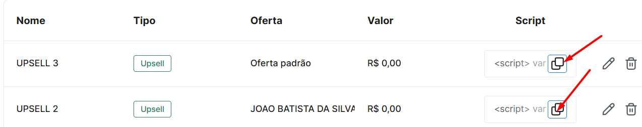 O sistema vai gerar um script automaticamente. Para que a estratégia funcione corretamente, você precisa copiar esse script e colar no HTML da sua página de Up-sell.