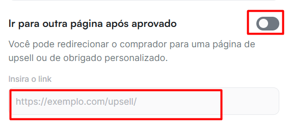 Navegue até encontrar a opção de "Ir para outra página após aprovado" e logo abaixo adicione o link da página/landing page do seu up-sell e clique em "Atualizar oferta".