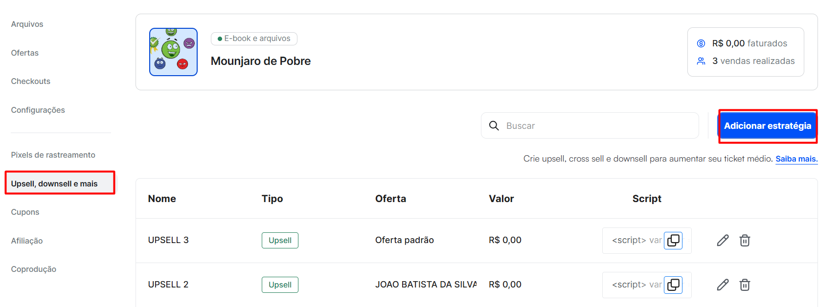 Para isso, clique em "Upsell, Downsell e mais" e clique em "Adicionar estratégia".