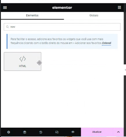 No Elementor, é necessário criar uma nova caixa de texto para inserir o script de Up-sell gerado na Kirvano. Para fazer isso, vá em "Elementos" e pesquise por "HTML".