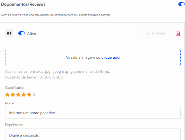 Use feedback positivo de clientes anteriores para influenciar novos. Coloque o nome do cliente, o depoimento e, se quiser, a foto dele também.