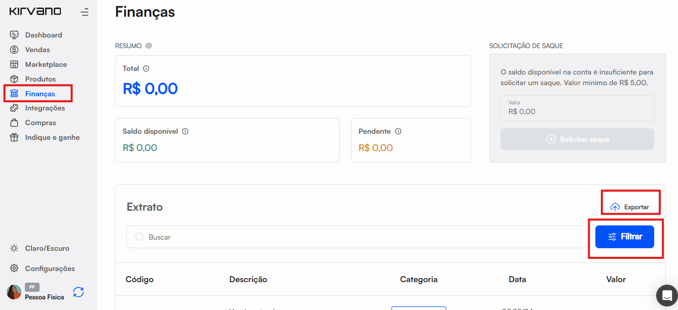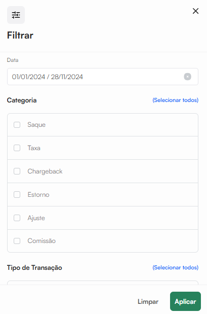 Para ajustar as informações conforme sua necessidade, aplique os filtros desejados em "Filtrar", como Data, Categoria e Tipo de Transação.