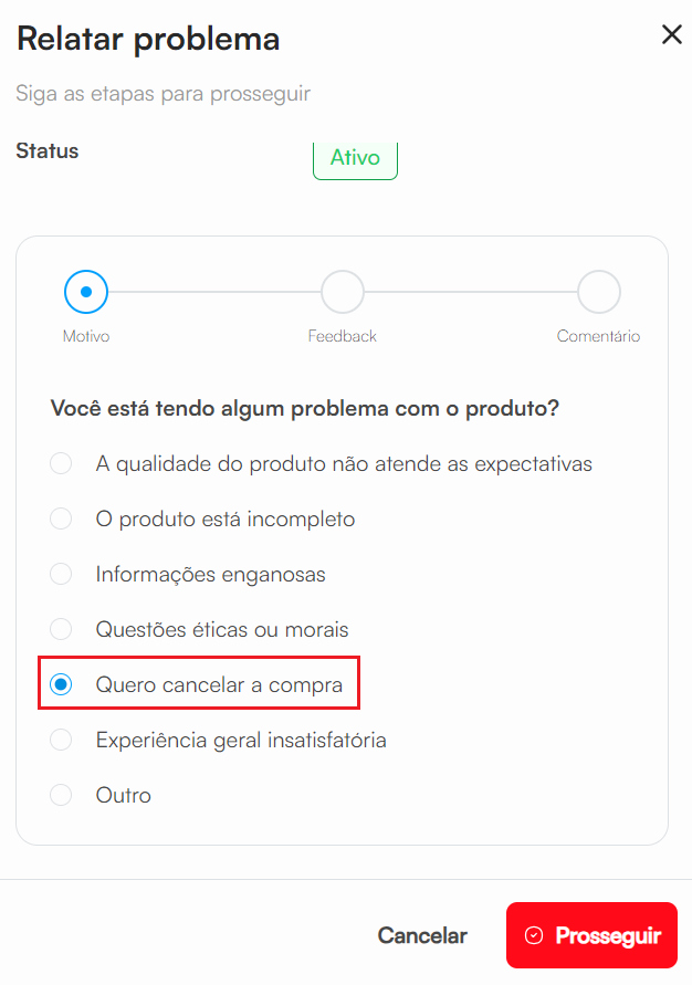 Selecione o campo Quero cancelar a compra e depois clique em Prosseguir.
